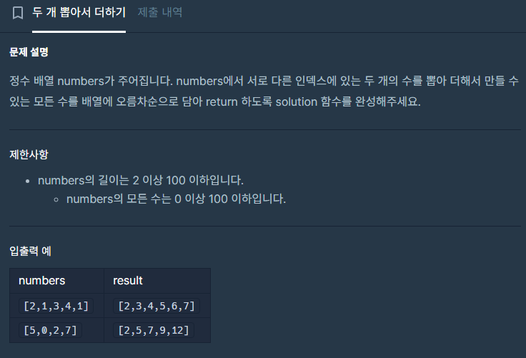 정수 배열 numbers가 주어집니다. numbers에서 서로 다른 인덱스에 있는 두 개의 수를 뽑아 더해서 만들 수 있는 모든 수를 배열에 오름차순으로 담아 return 하도록 solution 함수를 완성해주세요.