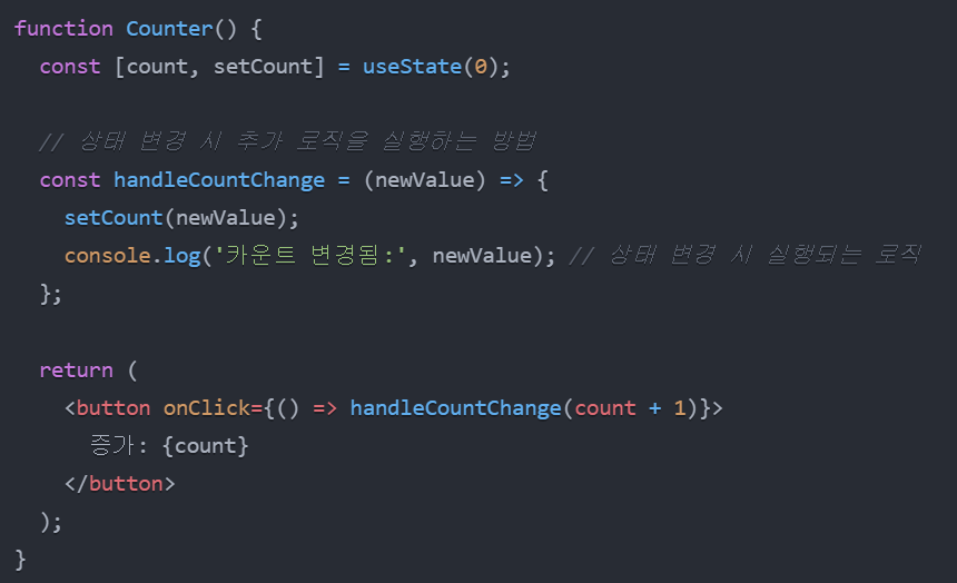위에서 설명했듯 useEffect는 특정 State 변수가 변경될 때마다 그 변경을 감지하고 특정 함수를 실행되게 할 수 있습니다. 그런데 돌이켜보면 우리가 앞서 배웠던 useState 함수도 잘 이용하면 state 변수값의 변경에 따라 특정 동작을 수행할 수 있었는데요.