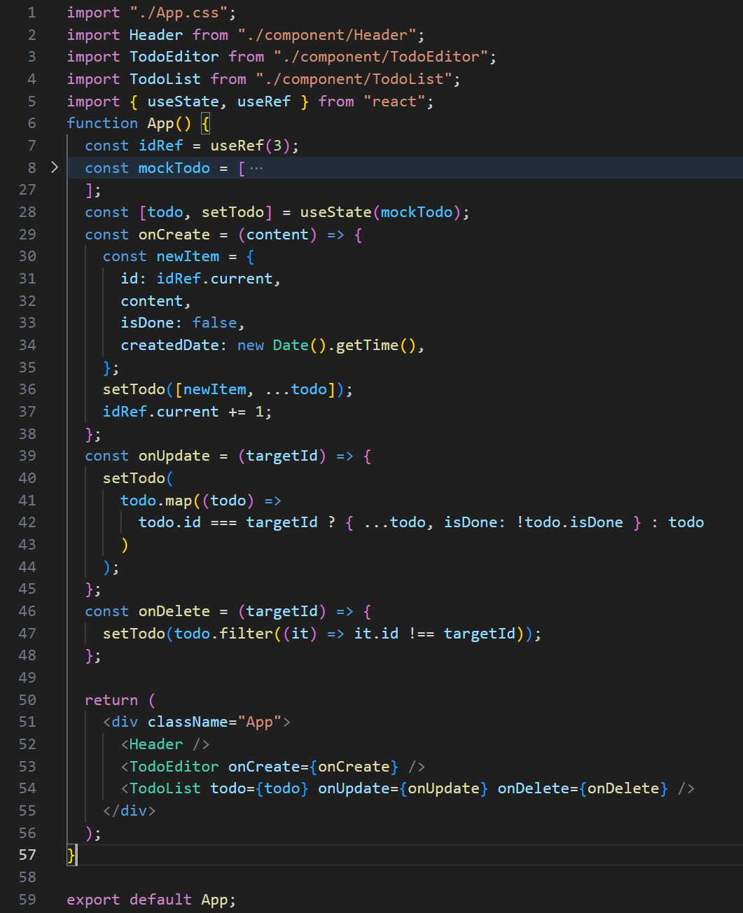 prop하여 자식 컴포넌트로 todo(할일 리스트를 담은 객체 배열)데이터를 내려 전달하고, onCreate, onUpdate, onDelete 함수를 전달해 자식 컴포넌트의 이벤트에 따라 해당 함수들이 실행되도록 했습니다.
