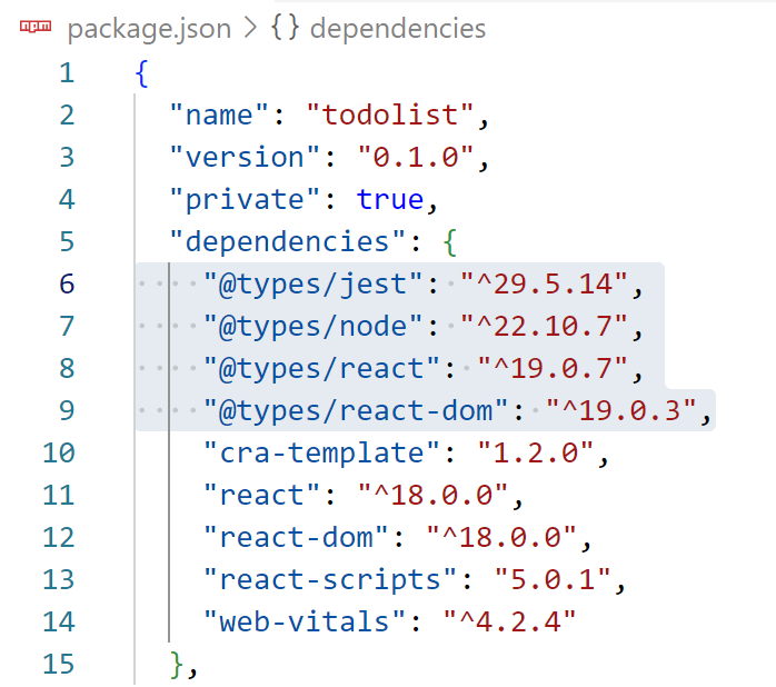 1) 리액트 앱을 위한 타입 정보들을 제공하는 패키지 설치
