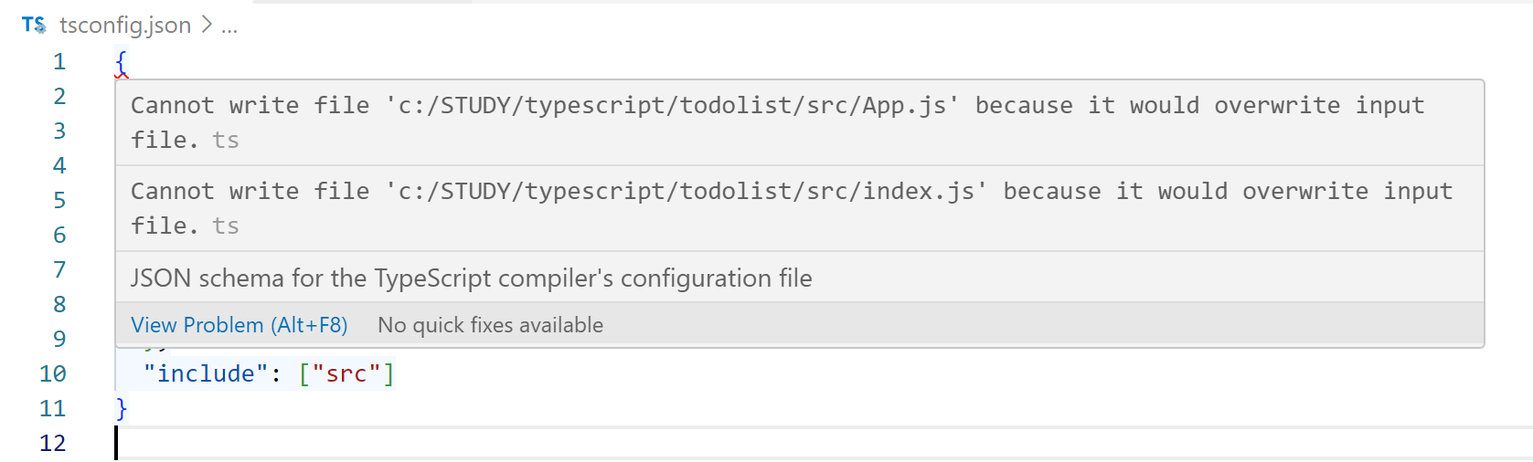 '~~.js 파일은 입력 파일을 덮어쓰므로 쓸 수 없습니다.' 라는 위 사진과 같은 오류가 tsconfig.json 파일에서 발생한다면. App.js 나 index.js와 같은 파일의 확장자를 jsx로 수정해야 합니다.
