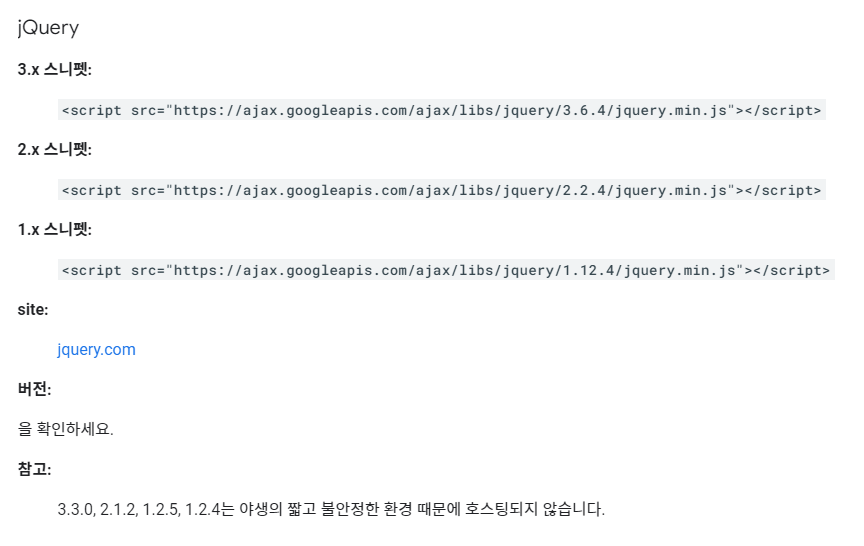 3. 아래와 같은 구문에서 원하는 CDN을 클릭해줍니다. 예시로 google CDN을 클릭하여 들어가보겠습니다. 아래 초록 화살표 링크를 클릭하면, 'Google Hosted Libraries'로 이동합니다.